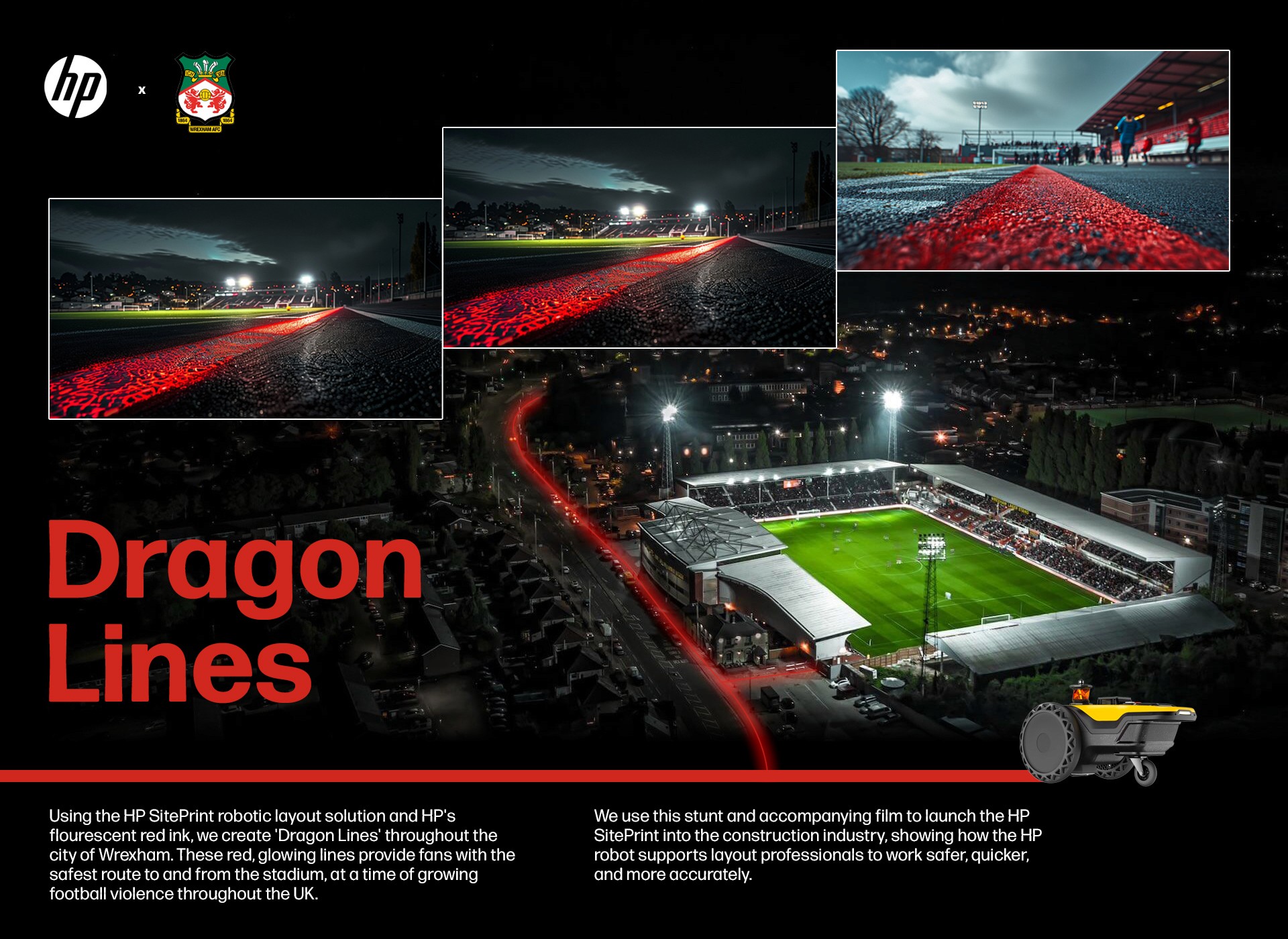 IDEA: Using the HP SitePrint robotic layout solution and HP’s fluorescent red ink, we’ll create Dragon Lines through the city of Wrexham. Glowing red lines along the pavements around the football ground–providing fans with the safest way to and from the stadium.